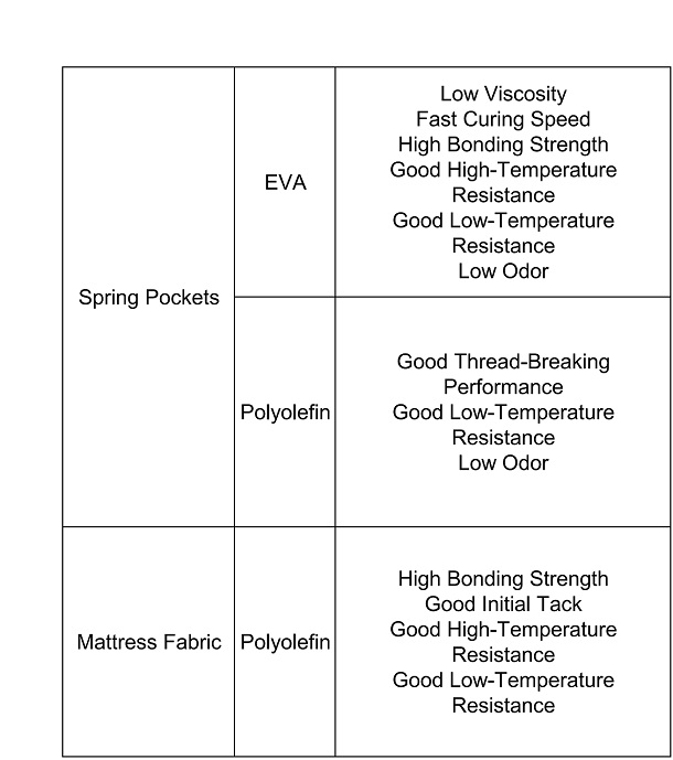 Low Odor: Compliant with environmental standards and suitable for clean scenarios. The hot melt adhesive features a low-VOC formula, releasing almost no odor during curing. It does not irritate operators in the assembly workshop or contaminate mattress fabric; finished mattresses have no residual adhesive odor. No odor is generated from adhesive layer decomposition during long-term use.
